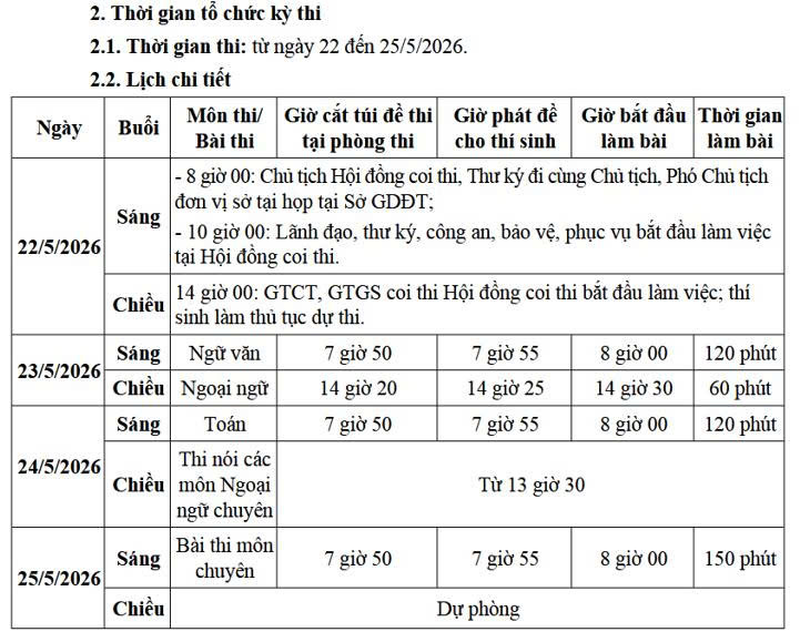 Ngày 25/5, buổi sáng tổ chức thi các môn chuyên; buổi chiều dự phòng.