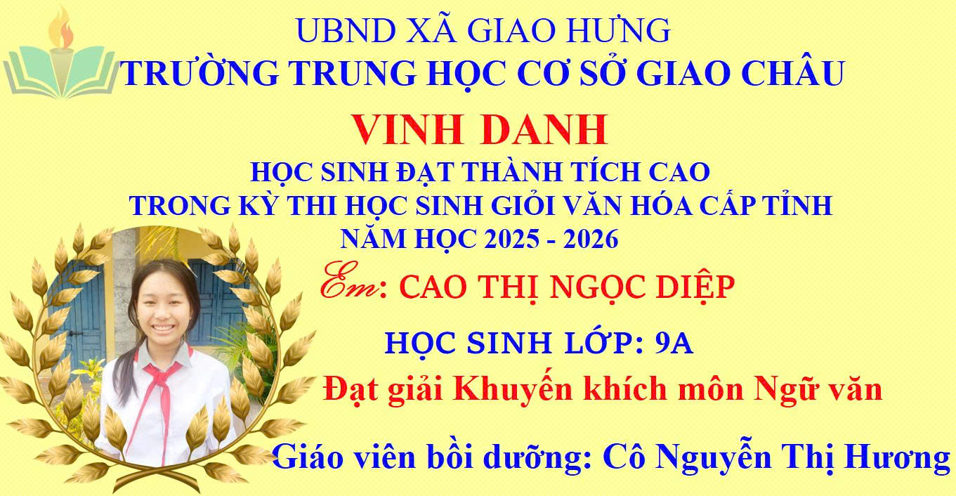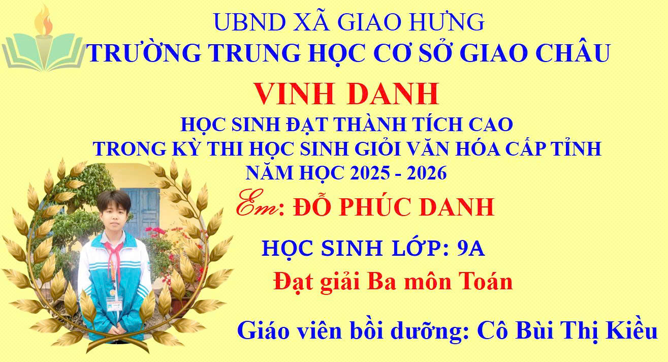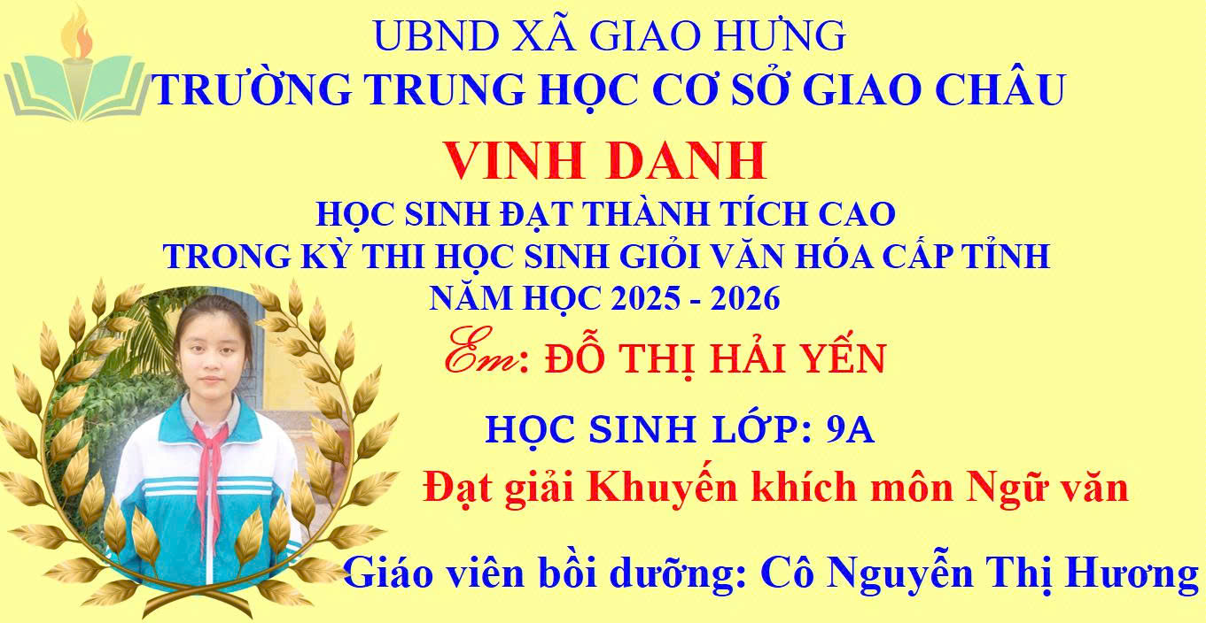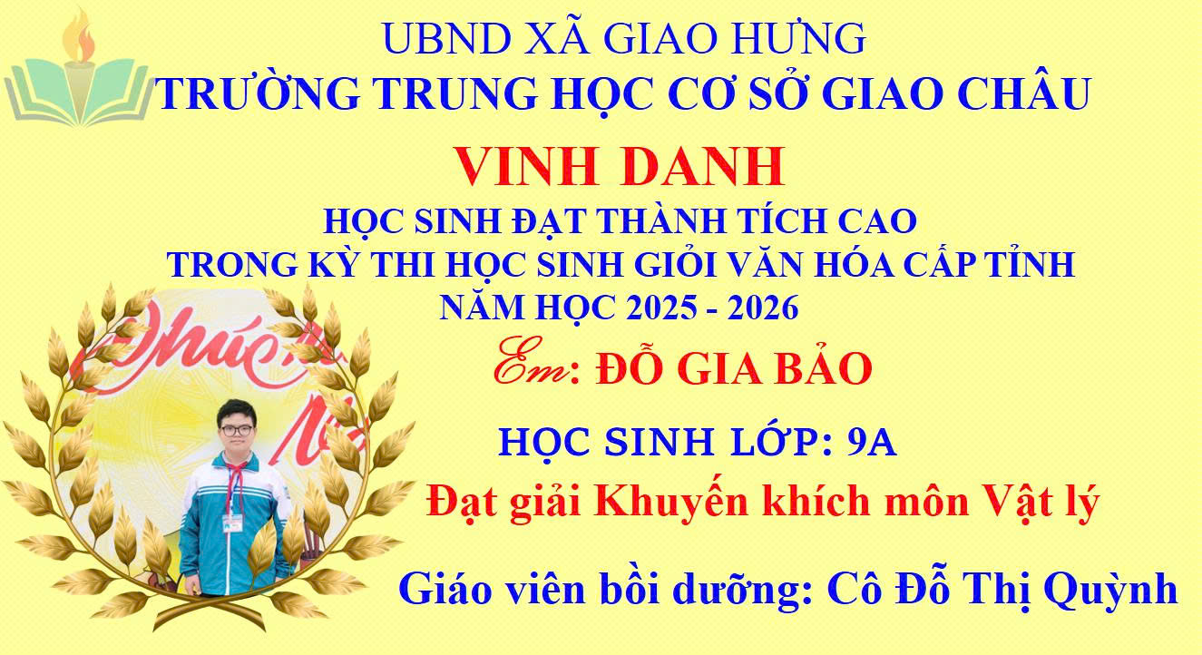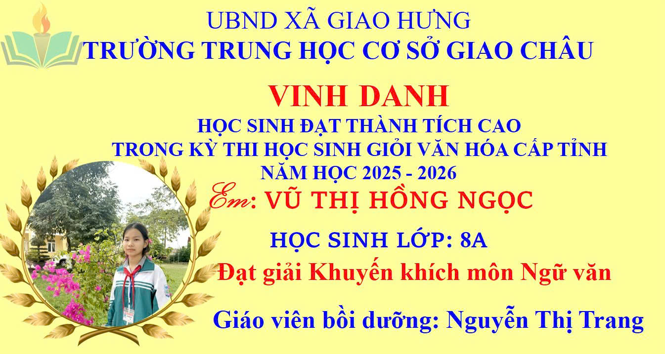 Niềm vui đã vỡ òa khi Kỳ thi chọn học sinh giỏi văn hóa cấp tỉnh năm học 2025–2026 chính thức công bố kết quả. Trường THCS Giao Châu tự hào ghi nhận những thành tích ấn tượng của các em học sinh – minh chứng cho sự nỗ lực bền bỉ, tinh thần quyết tâm và ý chí vươn lên không ngừng.